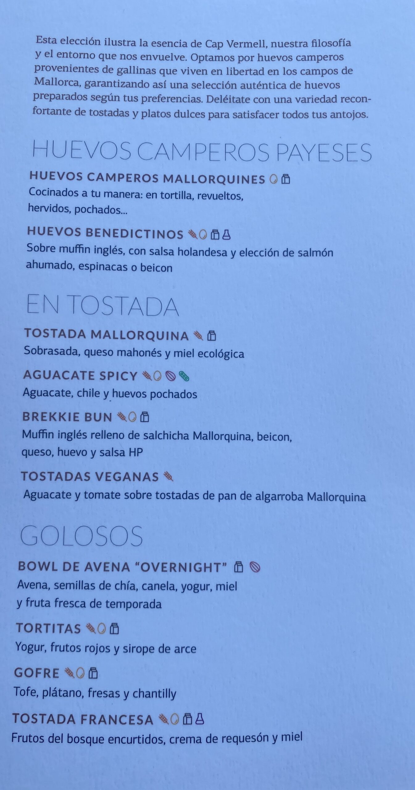 En su desayuno estilo buffet, los embutidos mallorquines, los quesos de las islas, repostería y panes elaborados en su propio horno, desfilan por enromes barras, además de disponer de cocina vista para los deseos del momento. No hay un solo cliente que se aloje en Cap Vermell Grand Hotel que no se acueste soñando con el desayuno.
