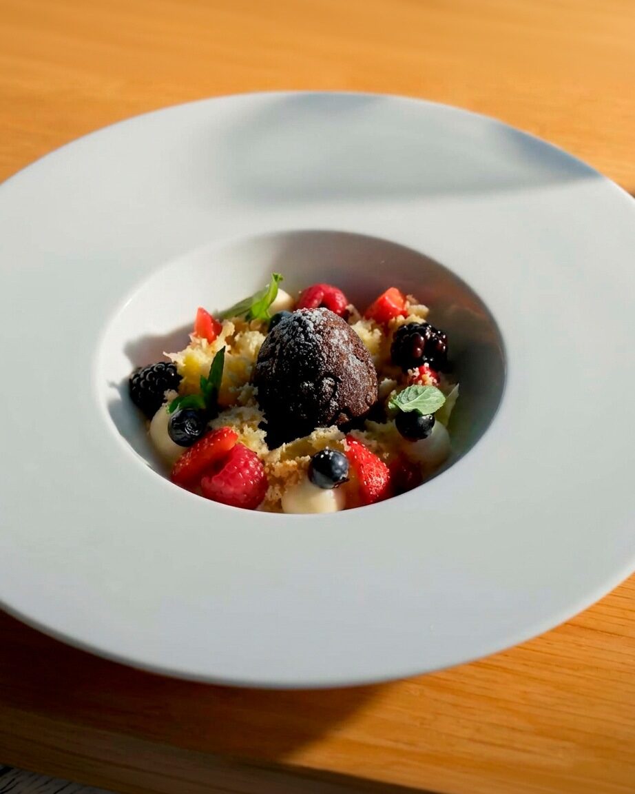 Tiramisú de licor de huevo con cacao y frutos rojo.