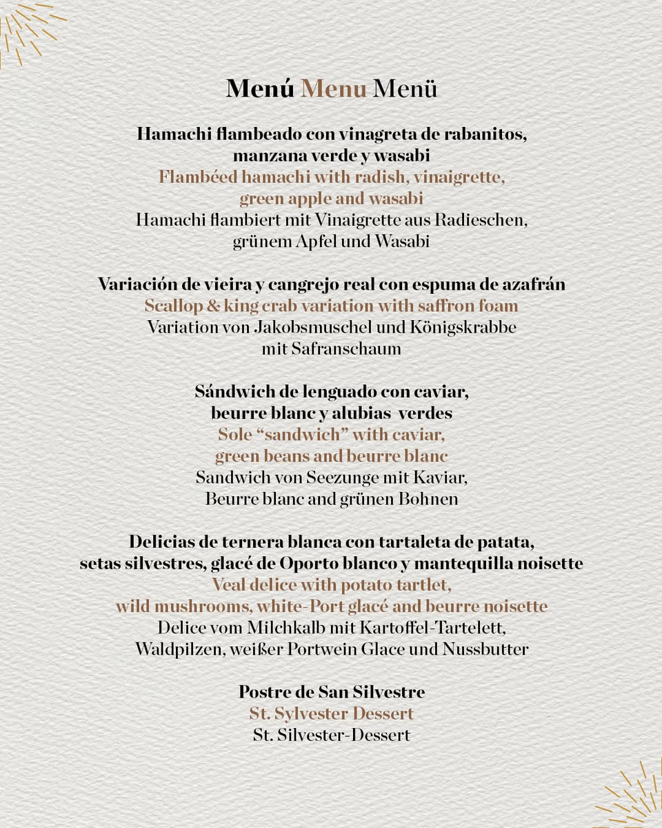 Para esta Nochevieja el chef Stefan Brunner apuesta por ‘Hamachi flambeado con vinagreta de rabanitos, manzana verde y wasabi, para seguir con variación de vieira y cangrejo real con espuma de azafrán, sandwich de lenguado con caviar, beurre blanc y alubias verdes y seguir con delicias de ternera blanca con tartaleta de patata, setas silvestres, glacé de Oporto blanco, y mantequilla noissette para finalizar con un postre de San Silvestre. Los ingredientes tradicionales de estas fiestas, como los chocolates, pescados, mariscos, caviar y verduras de temporada están muy presentes en la apuesta de Schwaiger para esta nochevieja.