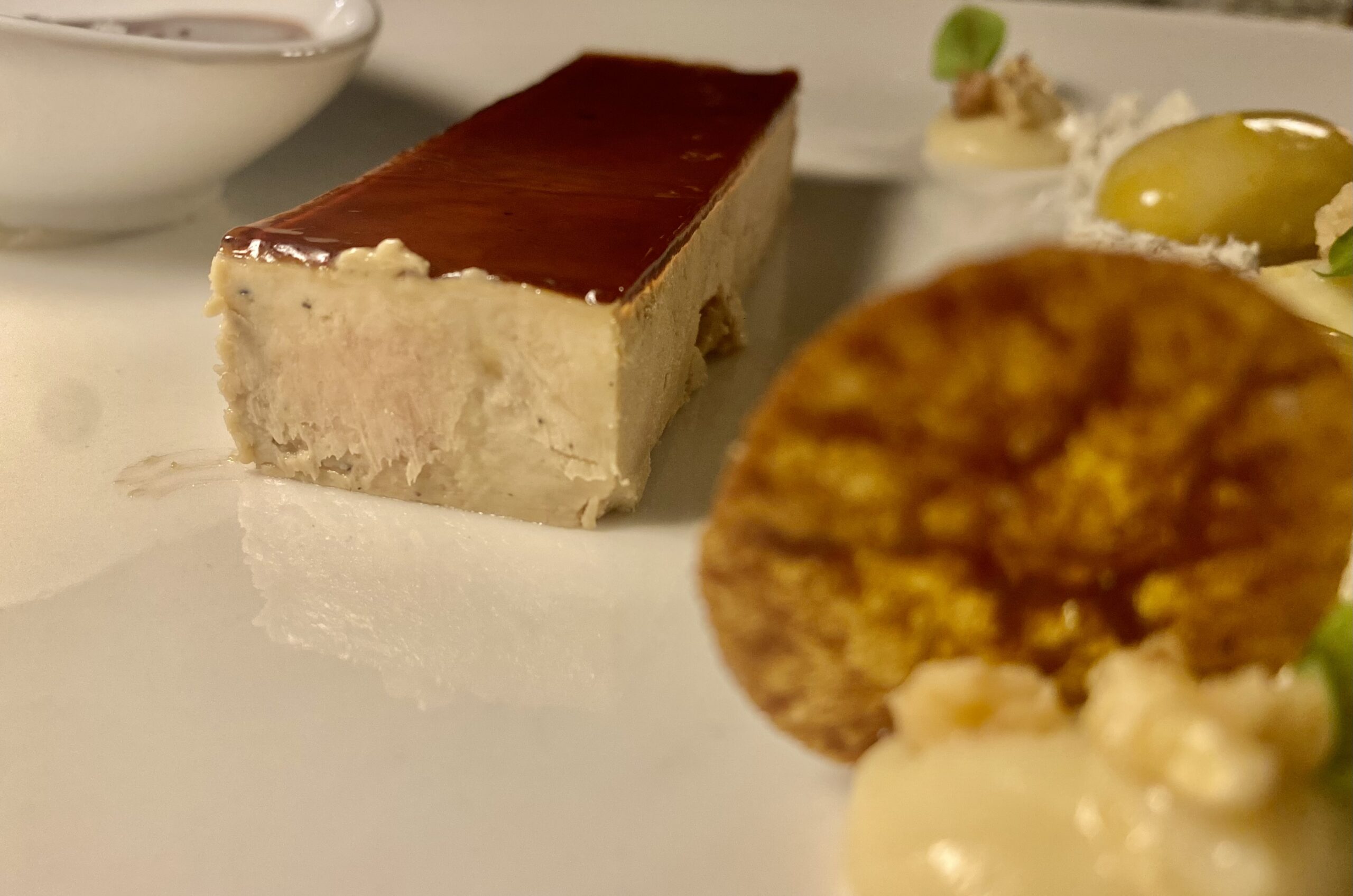 Terrina de hígado de pato “Foie gras” con gelé de vino Oporto, manzana verde, caramelo salado y Brioche casero.