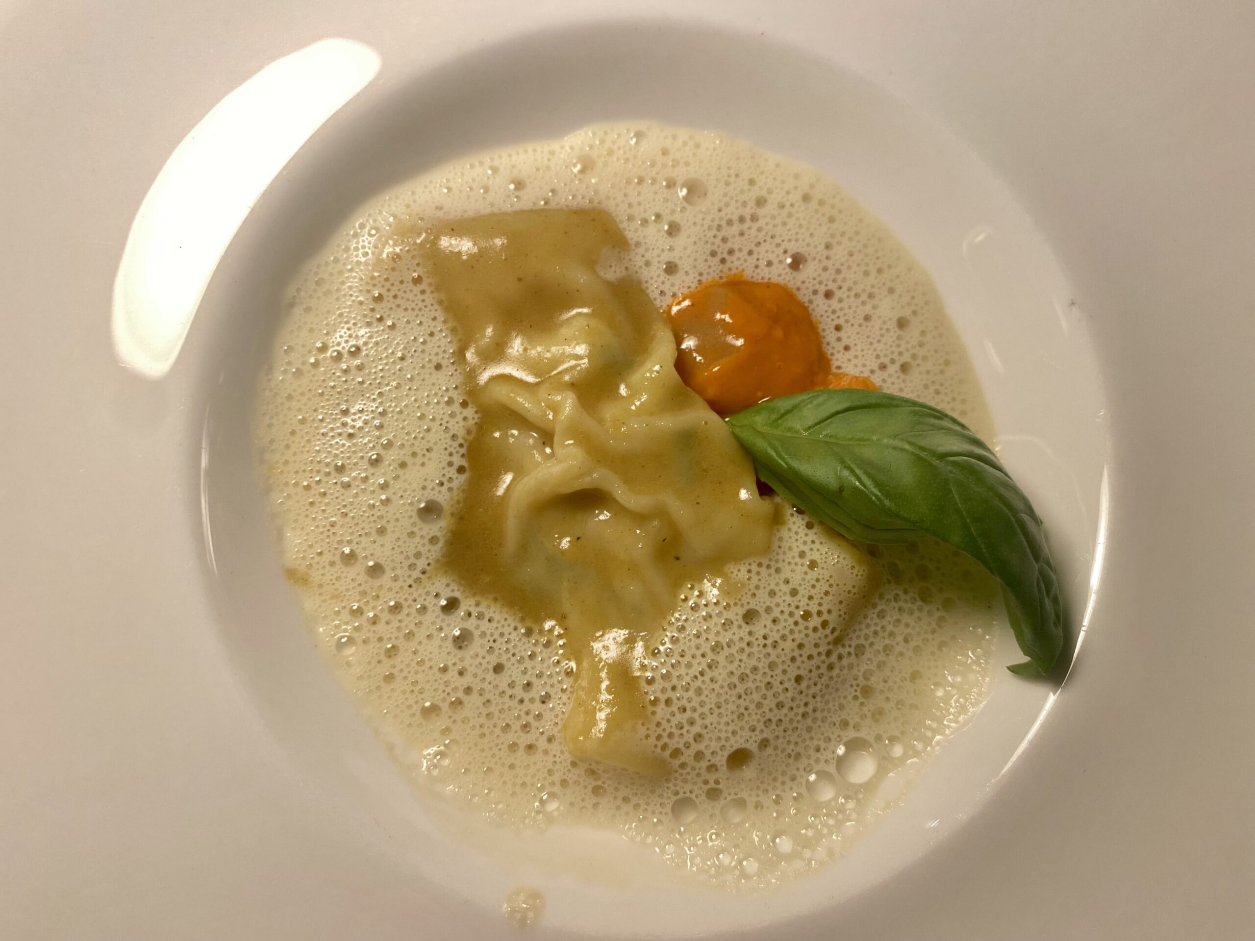 Ravioli de gamba de Sóller en mantequilla ligera de curry y tomate cherry estofado.
