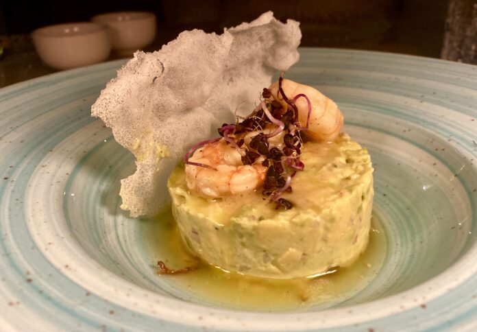Gambas sobre rösti con aguacate, albahaca y mantequilla de lima.