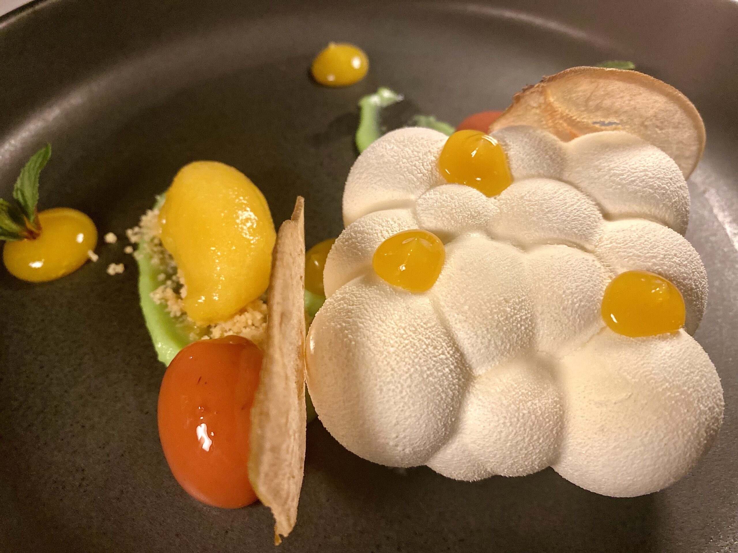 Y como postre, desde IB Magazine, recomendamos una exquisita sugerencia que siempre pedimos en nuestra visita a Schwaiger, variación de pera y manzana con crema Bavaria y sorbete de fruta de la pasión.